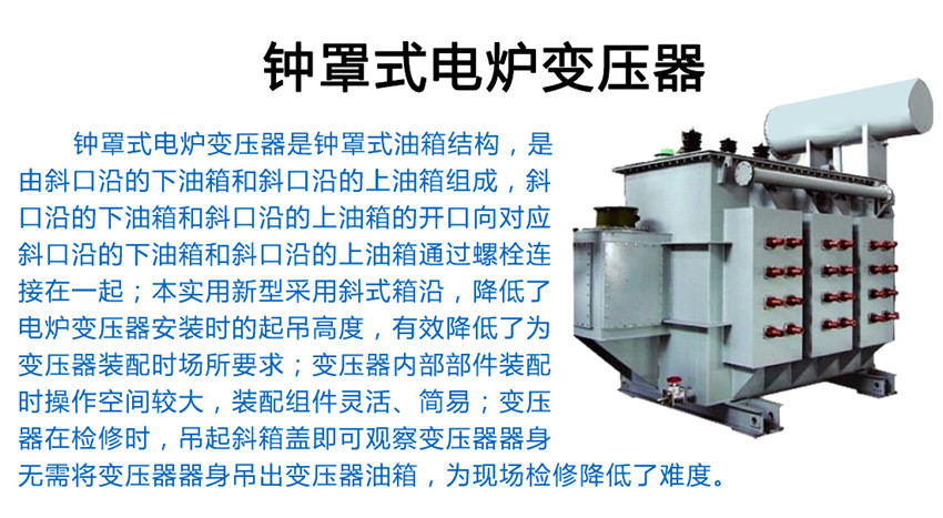 電爐變壓器斜鐘罩式油箱結構,是由斜口沿的下油箱和斜口沿的上油箱組成,斜口沿的下油箱和斜口沿的上油箱的開口向對應,斜口沿的下油箱和斜口沿的上油箱通過螺栓連接在一起;本實用新型采用斜式箱沿,降低了電爐變壓器安裝時的起吊高度,有效降低了為變壓器裝配時場所要求;變壓器內部部件裝配時操作空間較大,裝配組件靈活、簡易;變壓器在檢修時,吊起斜箱蓋即可觀察變壓器器身,無需將變壓器器身吊出變壓器油箱,為現場檢修降低了難度。