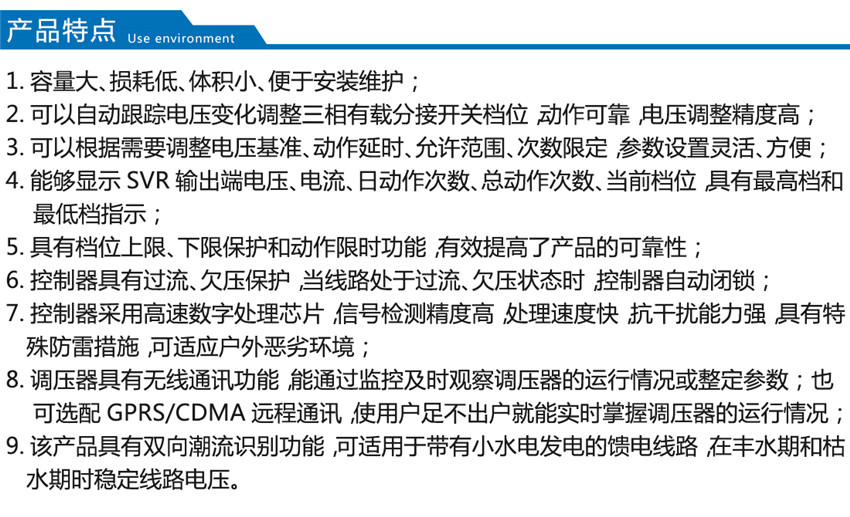 我公司生產(chǎn)的SVR型線路自動(dòng)調(diào)壓變壓器原理是SVR與10kV 柱上無功自動(dòng)補(bǔ)償裝置GWJ配合使用,可有效地解決線路電壓低及無功電源不足的問題。SVR 能有效地調(diào)節(jié)電路電壓, GWJ無功補(bǔ)償裝置能有效補(bǔ)償無功,提高功率因數(shù),降低線損,其效果相當(dāng)于一個(gè)簡(jiǎn)易的柱上變電站,而造價(jià)僅為常規(guī)變電站的1/6~1/10。而成本只有變電站的1/6,1/7,而且無需工作人員值班維護(hù)。