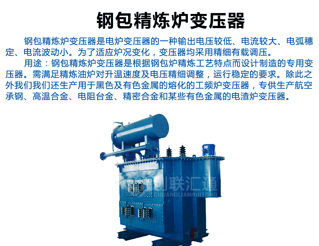 鋼包精煉爐變壓器是根據(jù)鋼包精煉工藝特點(diǎn)而設(shè)計、制造的專用變壓器,針對精煉爐對升溫速度及電壓精細(xì)調(diào)整、運(yùn)行穩(wěn)定的要求與之相對應(yīng)的設(shè)計原則,設(shè)計制造的爐用變壓器。鋼包精煉爐變壓器是電爐變壓器的其中一種,鋼包精煉爐變壓器輸出電壓較低、電流較大、電弧穩(wěn)定、電流波動小、為了適應(yīng)爐況變化采用有載調(diào)壓型較多。