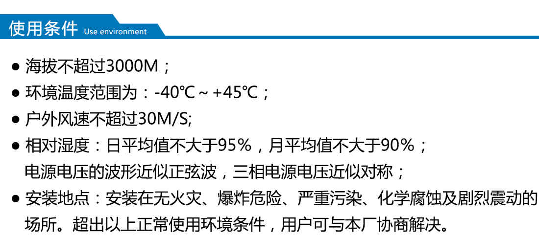適用于自然條件比較惡劣的海灘、草原、荒漠等無(wú)火災(zāi)、無(wú)嚴(yán)重污染、無(wú)化學(xué)腐蝕介質(zhì)和粉塵、無(wú)爆炸性危險(xiǎn)運(yùn)行環(huán)境,可用于戶(hù)外、又可用于戶(hù)內(nèi)。